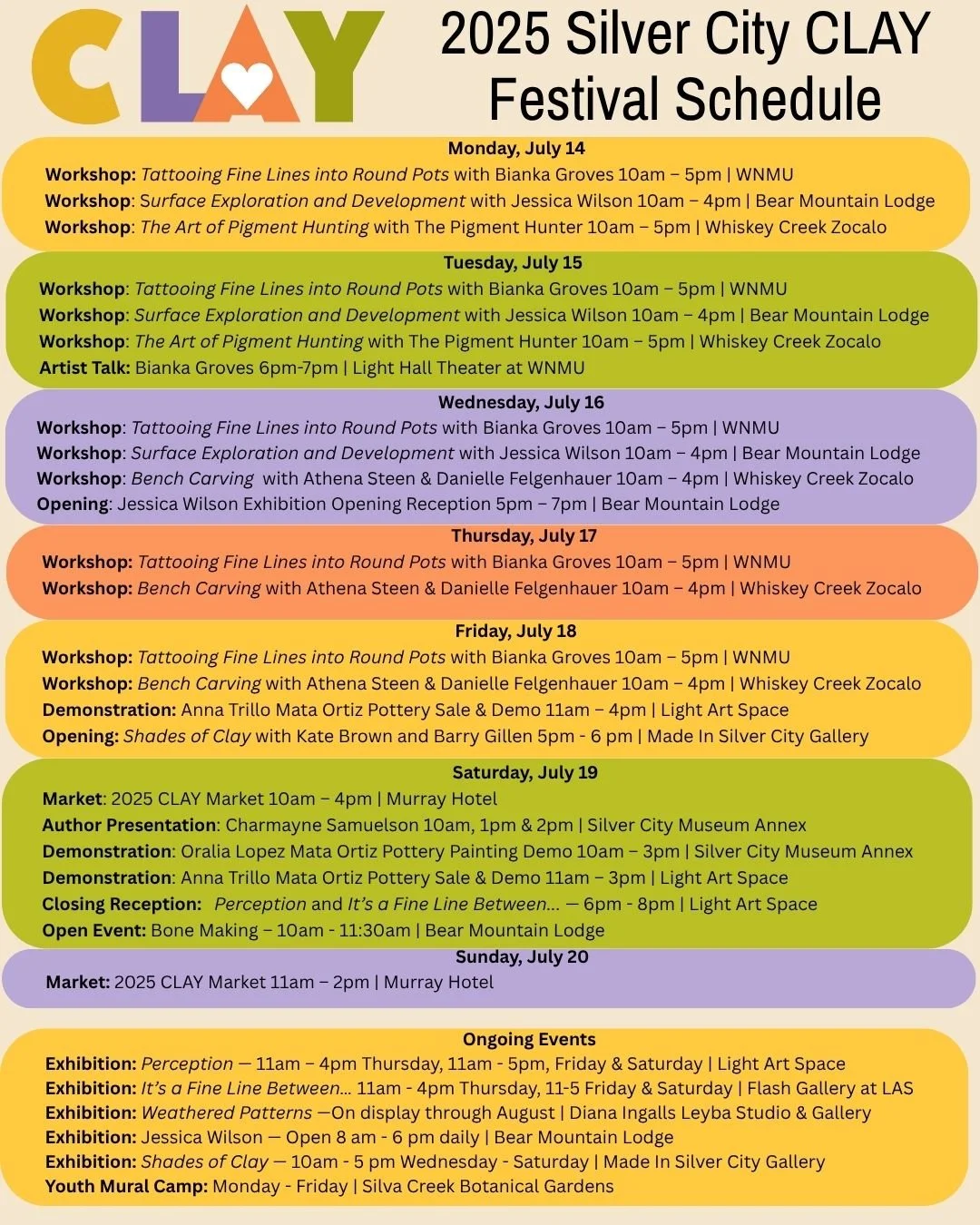 Explore Silver City’s geological landscape while learning to identify, responsibly collect, and process natural pigments and clays for use in ceramics, clay bodies, plasters, slips, glazes, and paints. Participants will use maps to study local mineral formations and prepare materials through levigation, sifting, and milling.